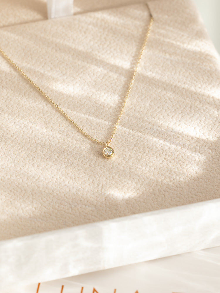Experience the embodiment of light, life, and sun with the Diamond Sky Necklace. The necklace, crafted from solid 9K gold, features a solitary 0.045ct brilliant cut diamond that perfectly sparkles like a constellation in the sky.