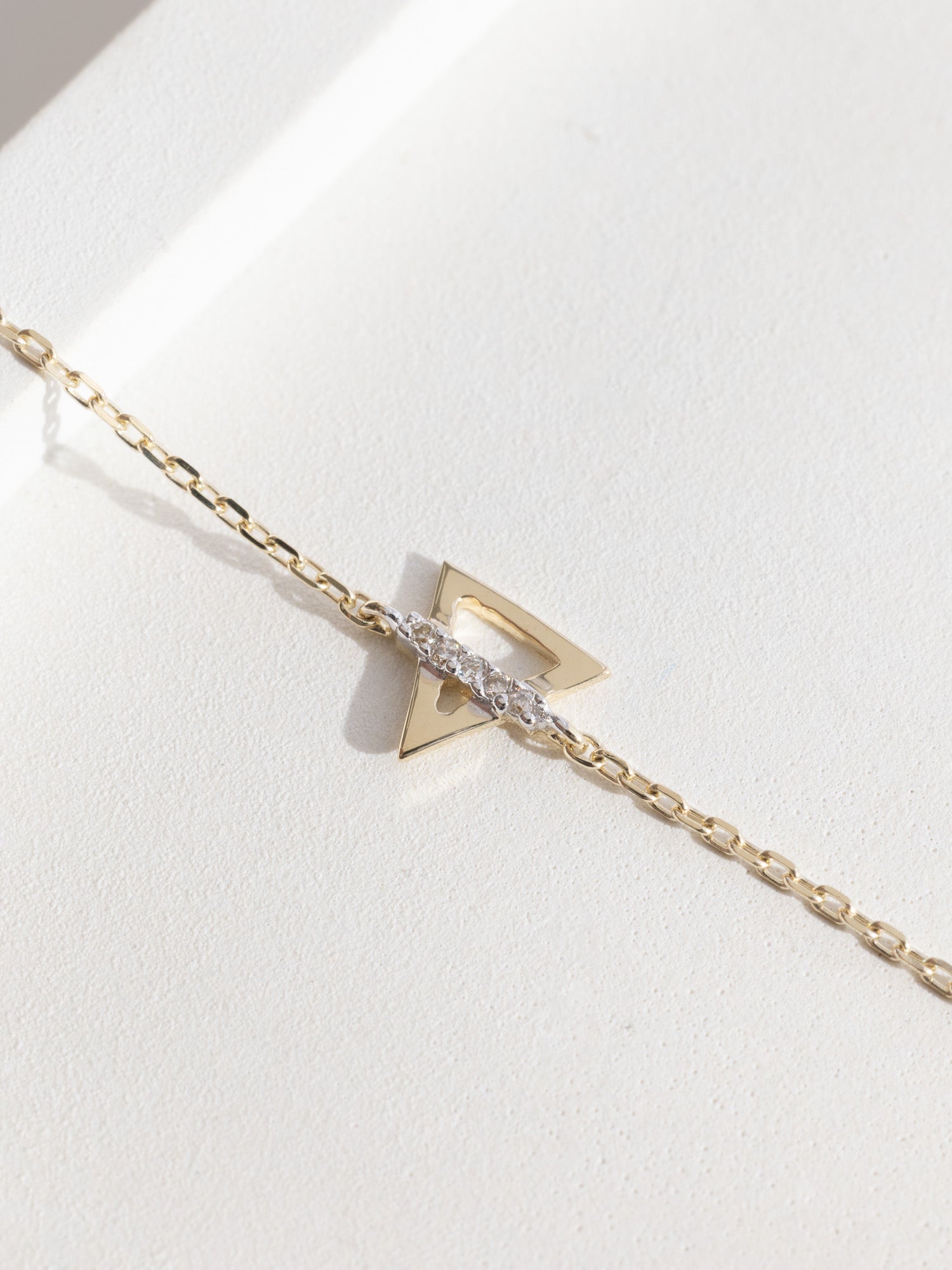 The Earth Element Bracelet is a unique and personal expression of your identity, with the earth triangle in solid 9K gold pointing downwards towards the ground and a line of diamonds running through the middle, symbolising Earth.