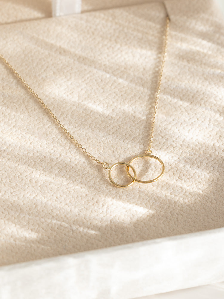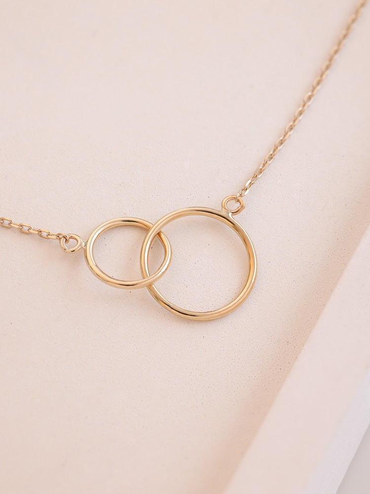 Two intertwined circles cast in solid 9K gold depict an everlasting bond, making it an ideal piece for mothers and children, best friends, or soul mates. This dainty, everyday style necklace features two rings - one large and one small, linked together in a representation of unity and infinite love.