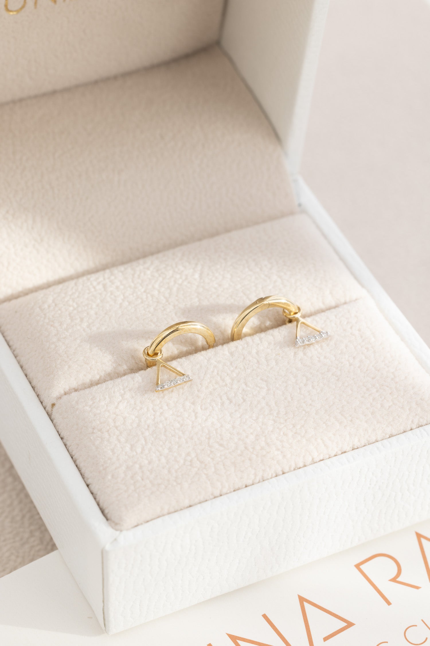 The hoops showcase a Fire triangle charm in solid 9K gold that points upwards like a flame, embellished with a line of delicate white diamonds that represent the essence of Fire.