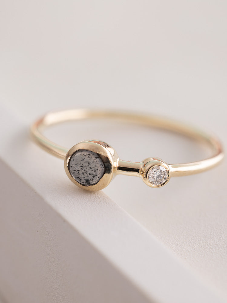The Stellar Ring has a gold weight of approximately 0.9 grams. The band is 1mm thick, with a diamond feature of 2.5mm and a labradorite feature of 4.5mm. The ring is available in three sizes: small (size 6, 16.3mm internal diameter), medium (size 7, 17.1mm internal diameter), and large (size 8, 17.9mm Internal diameter).