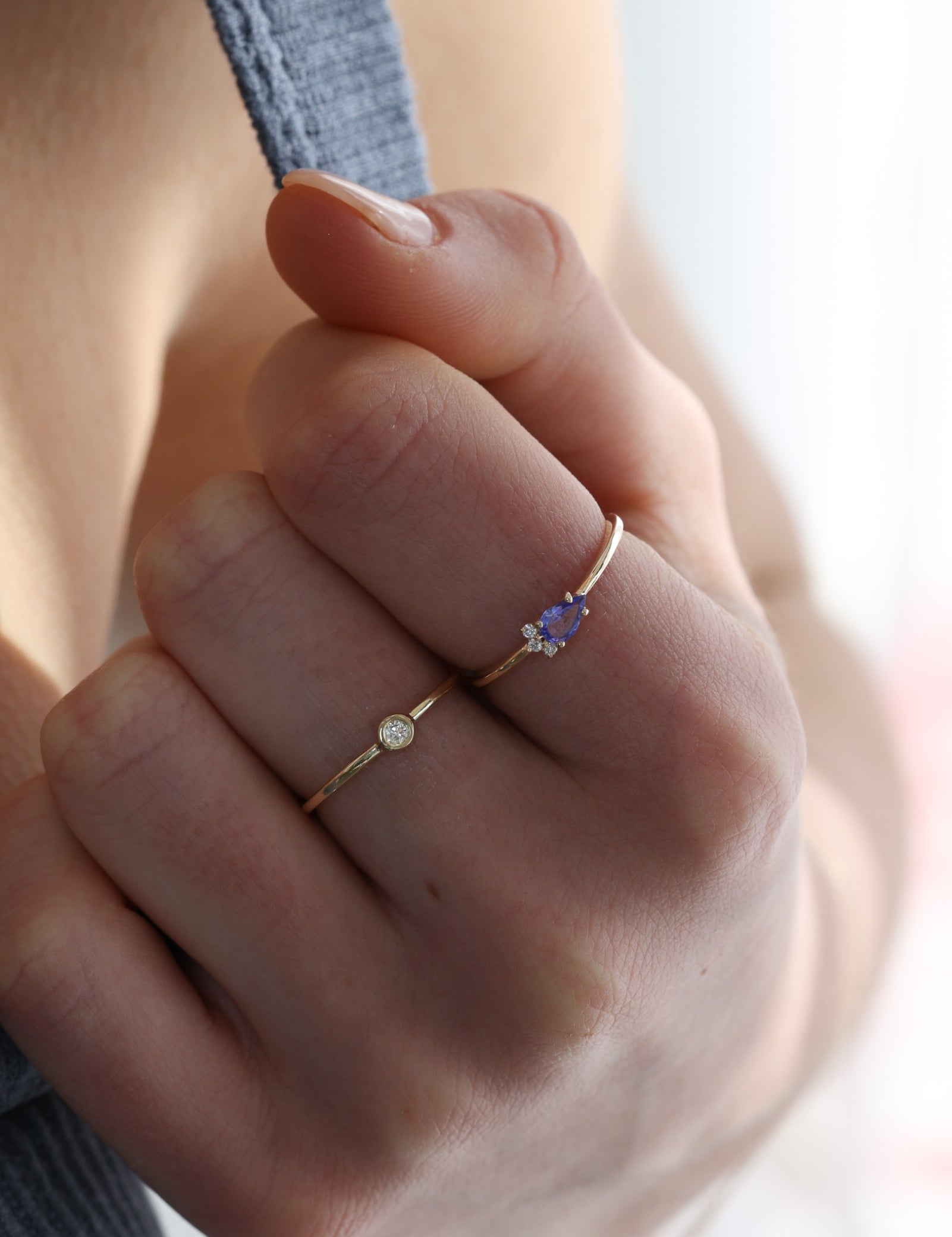 The Tanzanite Dream Ring features a band width of 1.20mm and a thickness of 1.10mm, adorned with three 1.20mm round white diamonds (F/C, I1-I2, I color).The stunning 5x3 mm AAA-grade pear-cut Tanzanite at the center has an average weight of 0.024ct. Crafted from solid 9k gold, the ring offers a perfect blend of elegance and brilliance, weighing approximately 0.98 grams.