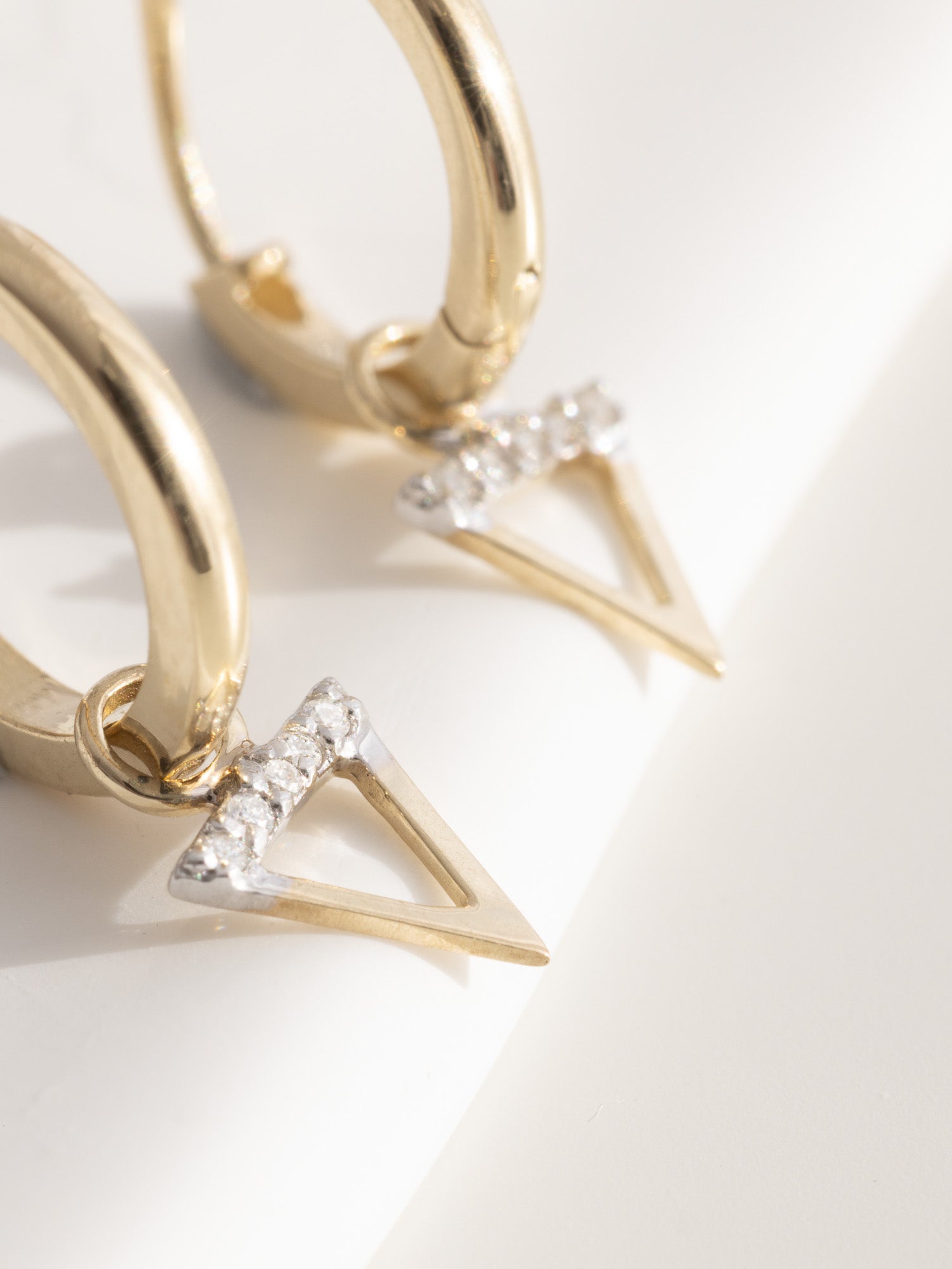Each Water Element Hoop maintains a balance of delicacy and substance, with a gold weight of 1.08 grams per hoop and the triangle pendant measuring 5mm on each side. Adorned with five 0.8mm brilliant-cut white diamonds, these earrings reflect the essence of water signs with their unique design.
