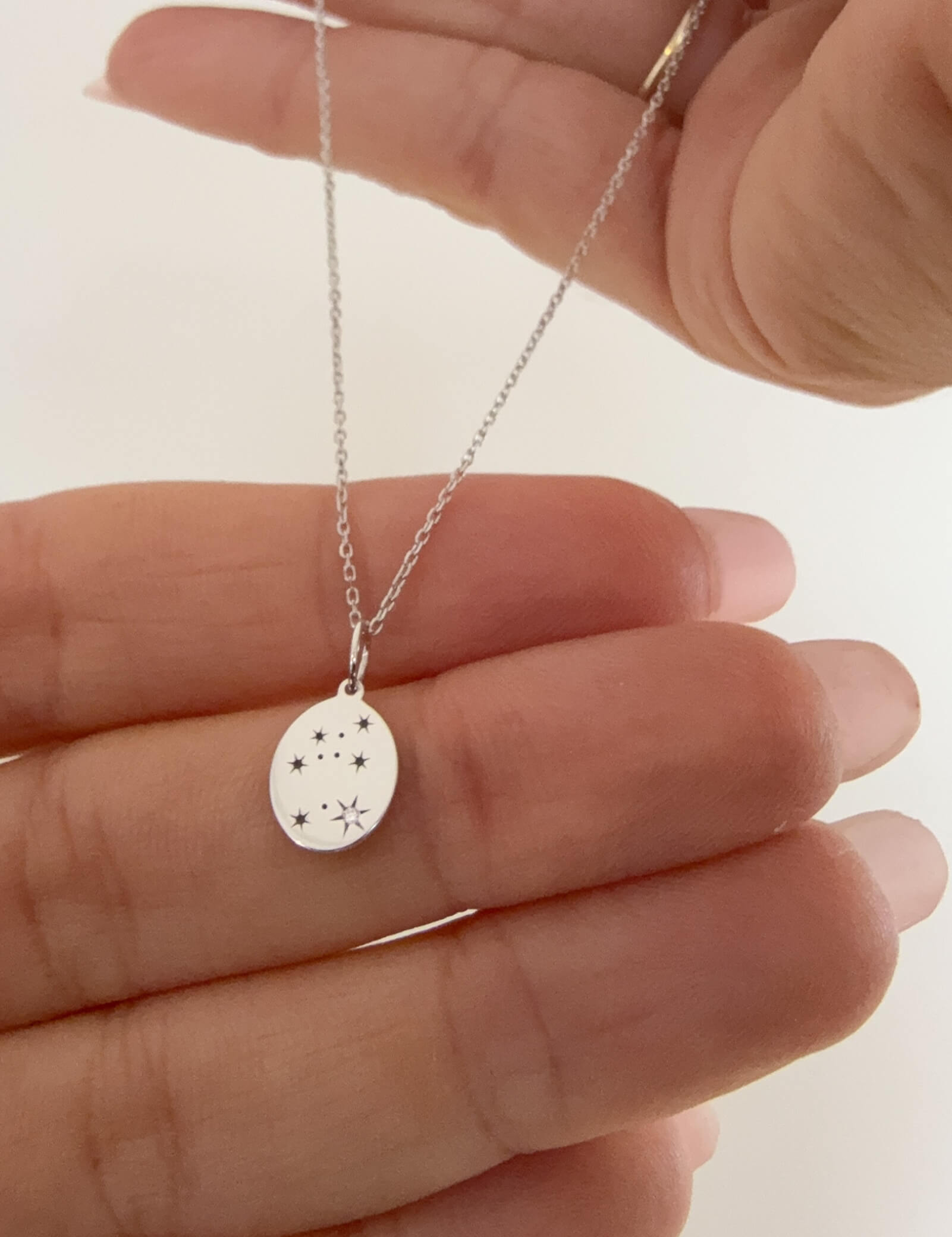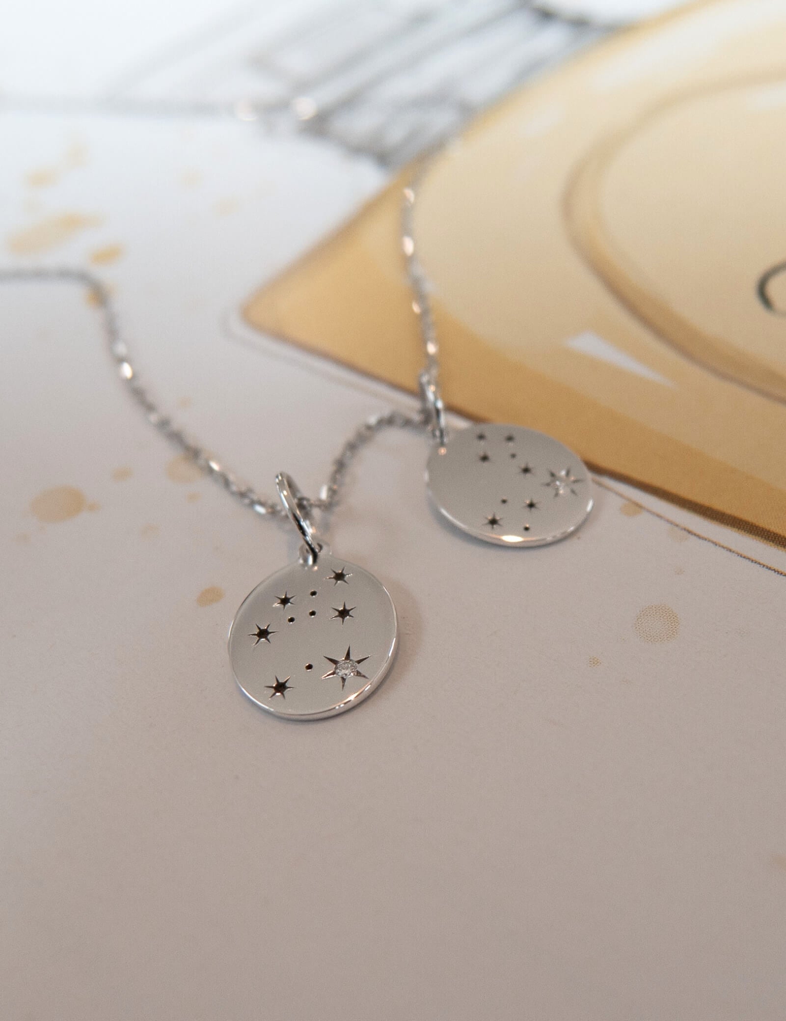 The pendant depicts the constellation pattern, fashioned from solid 9K white gold with a single white diamond marking the Porrima star. Available with a 40 - 45 cm necklace with 5 cm extension, this necklace is versatile, significant, and personalized to your astrological sign.