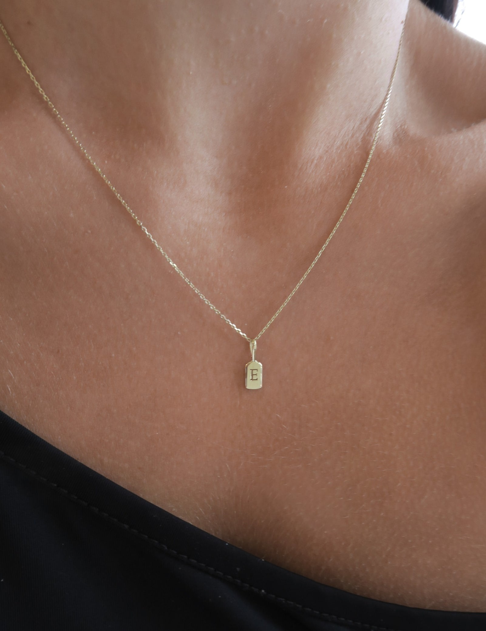 The Luna Letter E charm measures 11mm x 3.6mm, ensuring a subtle yet distinct presence on any outfit.