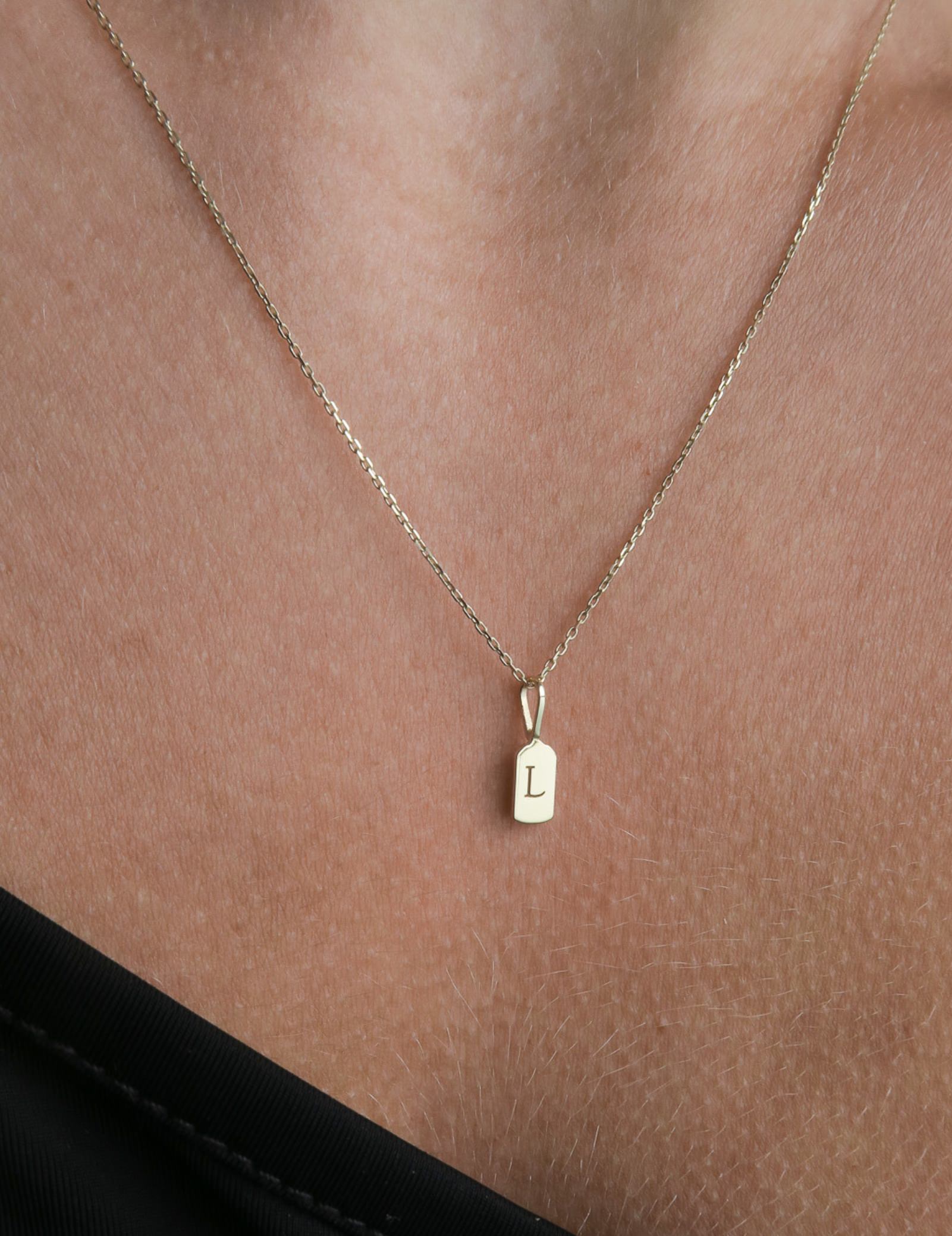 The delicate typewriter-style font allows it to hang as a single charm or be layered with other Luna Letters, creating a personalised piece. Available as a standalone charm or with a solid gold chain of varying lengths, it's a lightweight yet distinctive accessory.