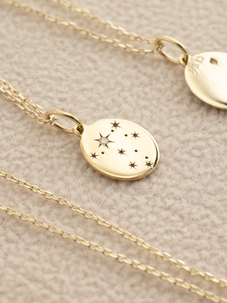 Available as a charm only or paired with either a 50cm or 45cm solid gold chain, this necklace is adaptable, meaningful, and personal to your astrological sign.